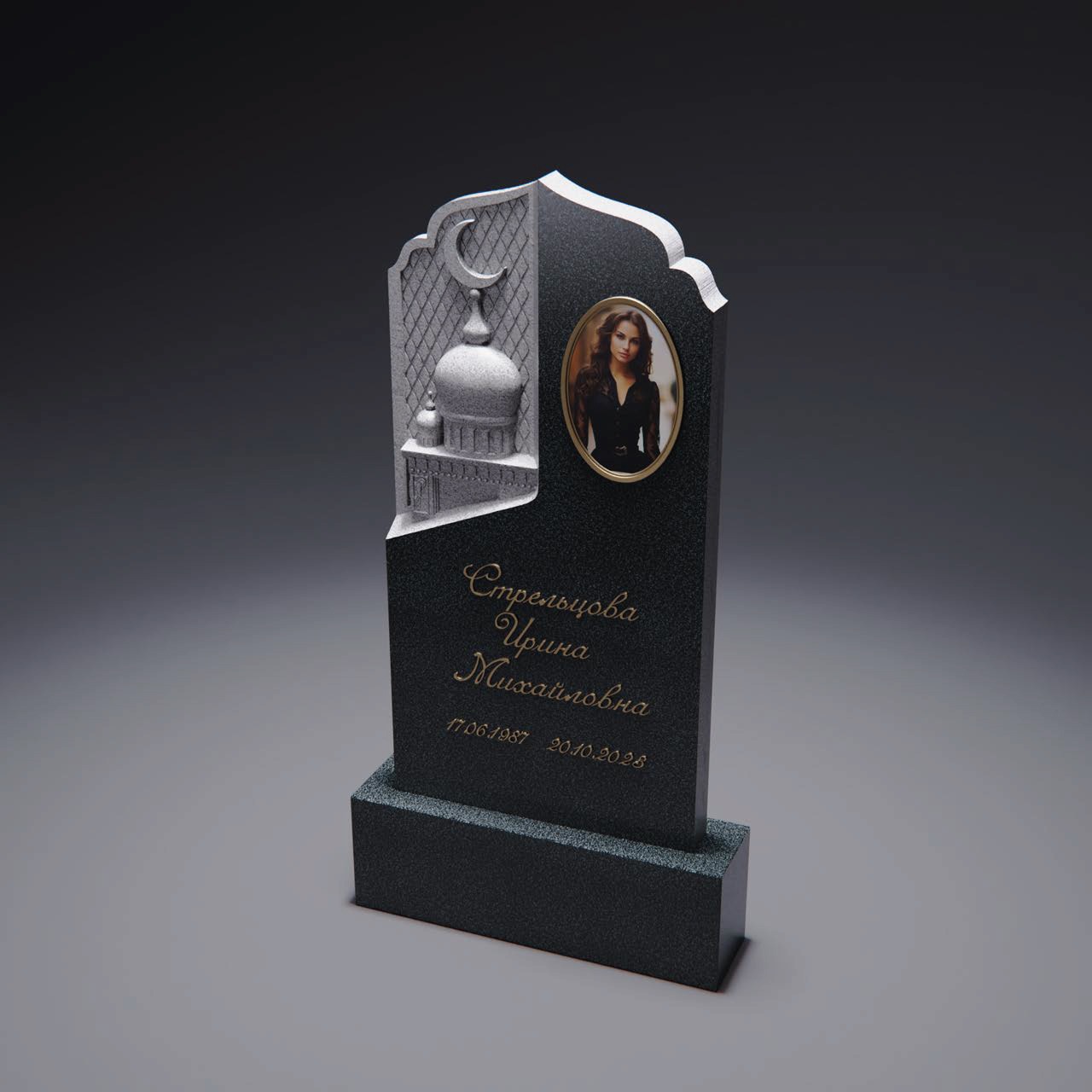 Строгий памятник с плавным силуэтом, выполненный из цельного гранита. В верхней части расположен крест, а сбоку силуэт украшен резной драпировкой, ниспадающей по линии памятника. Такое оформление придаёт композиции символичность и завершённость. Нижняя часть памятника установлена на прочное основание с полированной поверхностью для надписи.