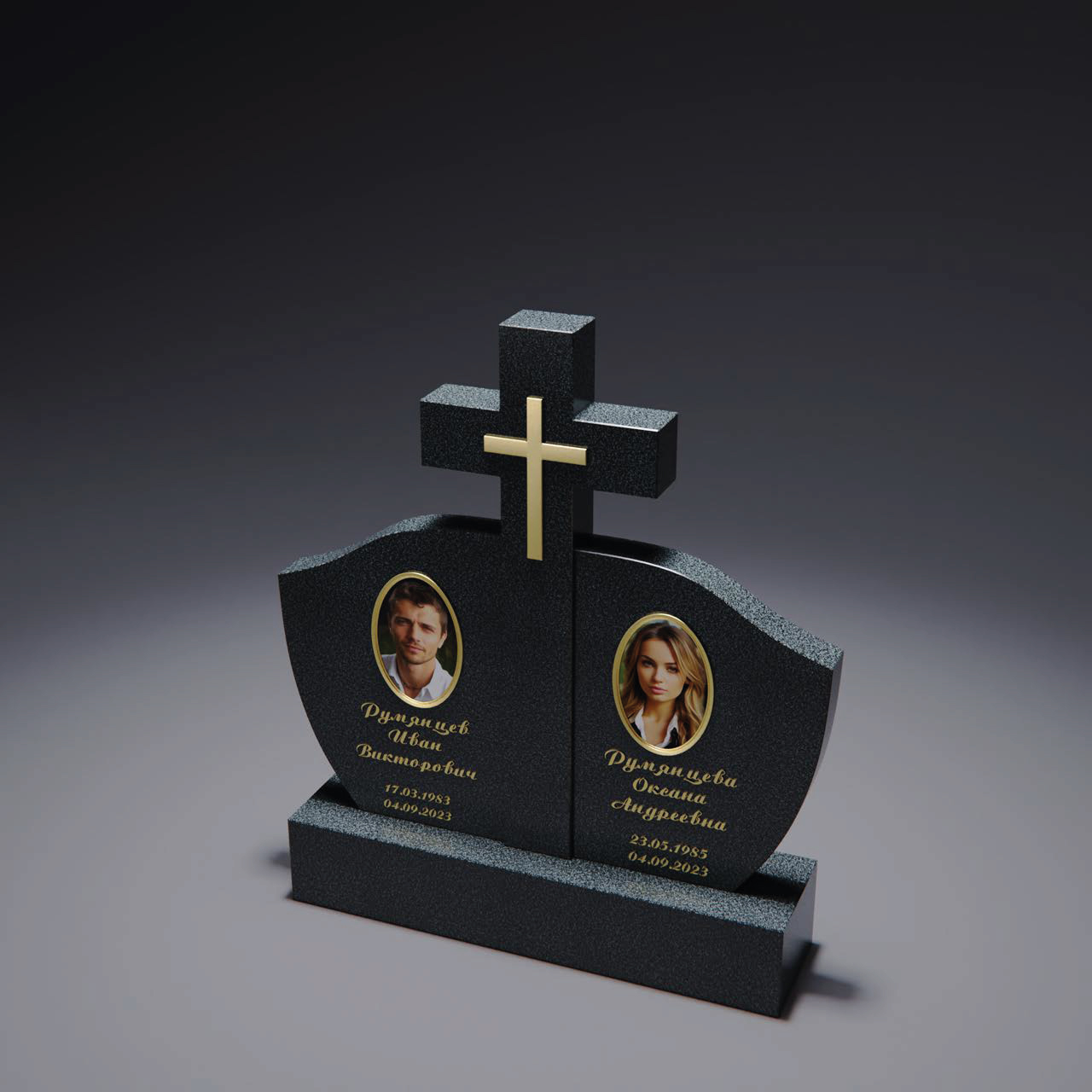 Строгий памятник прямоугольной формы, украшенный вертикальной резьбой по боковой линии. В центре композиции размещён овальный керамический портрет, а левая сторона дополнена резной композицией из цветов и листьев, плавно спускающихся к основанию. Такое оформление создаёт гармоничный контраст строгих форм и декоративной пластики. Основание выполнено из цельного гранита, подчёркивая прочность конструкции.