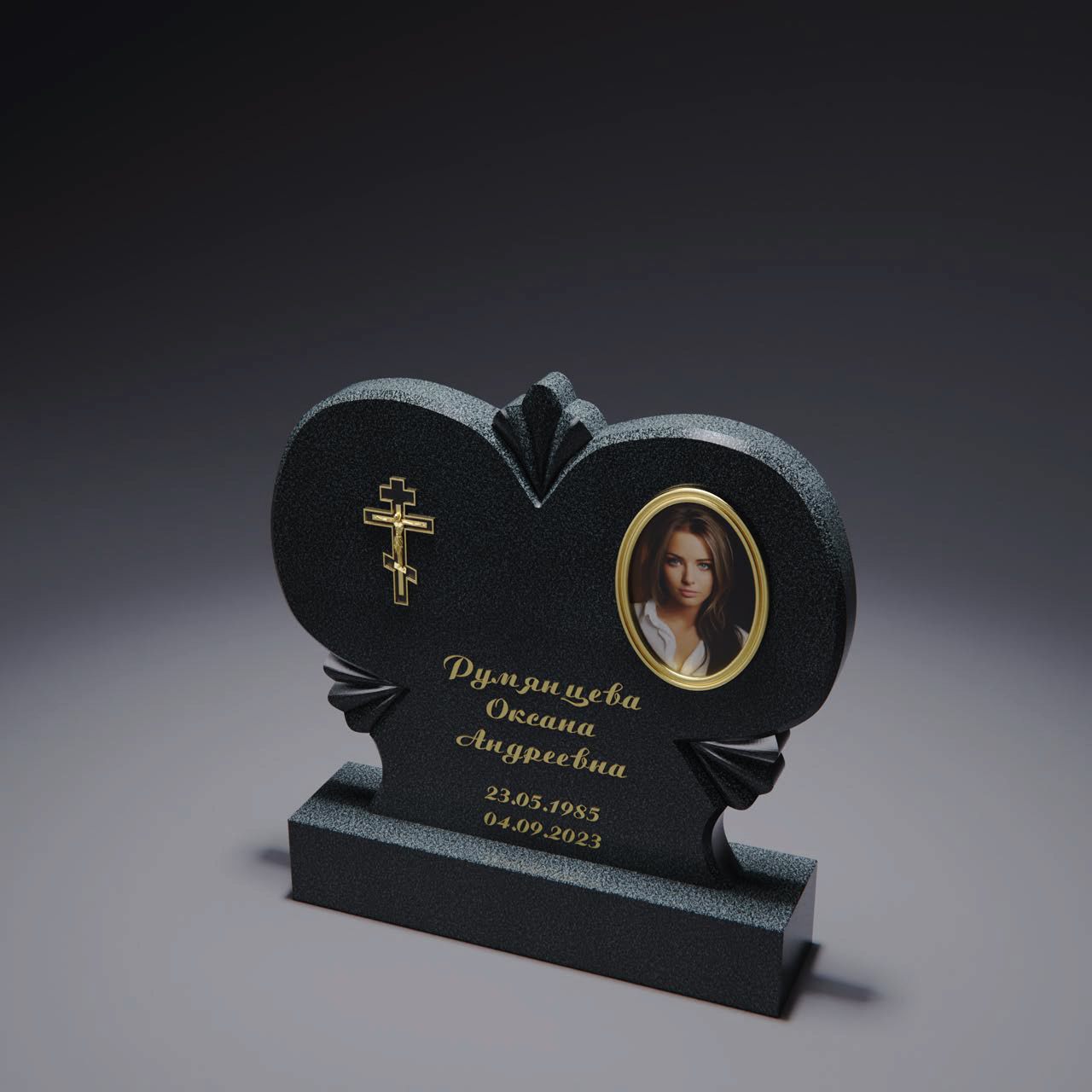 Оригинальный памятник в форме сердца, выполненный из гранита. Сбоку композицию украшает резной медвежонок, который словно обнимает сердце, создавая трогательный и символичный образ. В нижней части присутствует декоративная резьба в виде цветов, плавно переходящая к основанию. Такое оформление особенно подчёркивает нежность и светлую память. Цельное основание обеспечивает прочность и устойчивость.