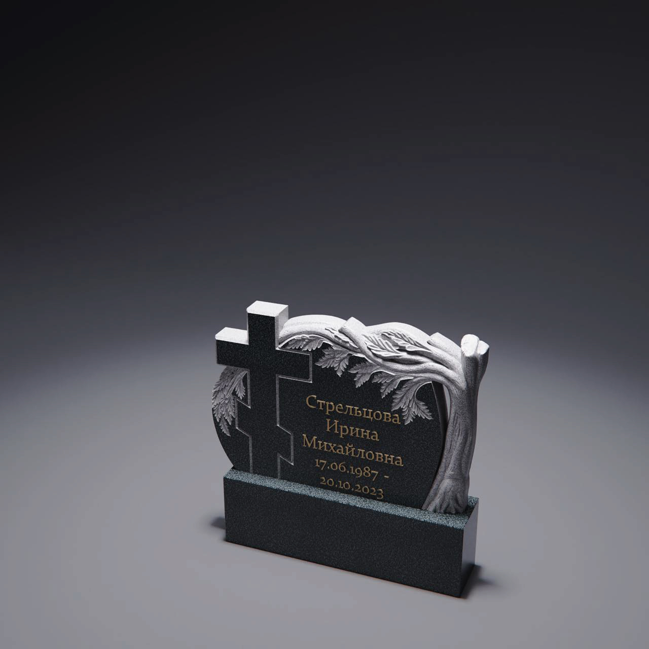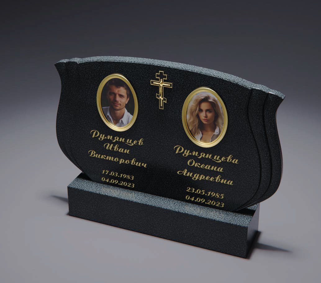 Современный памятник строгой геометрии с оригинальным асимметричным силуэтом. Композиция разделена на две части, где слева расположено поле с крестом, а справа — портрет в овальной раме и надпись. В центре проходит плавная волнообразная линия, создающая эффект разреза и подчёркивающая динамику формы. Нижнее основание массивное, с плавным переходом, что придаёт конструкции устойчивость и завершённый вид.