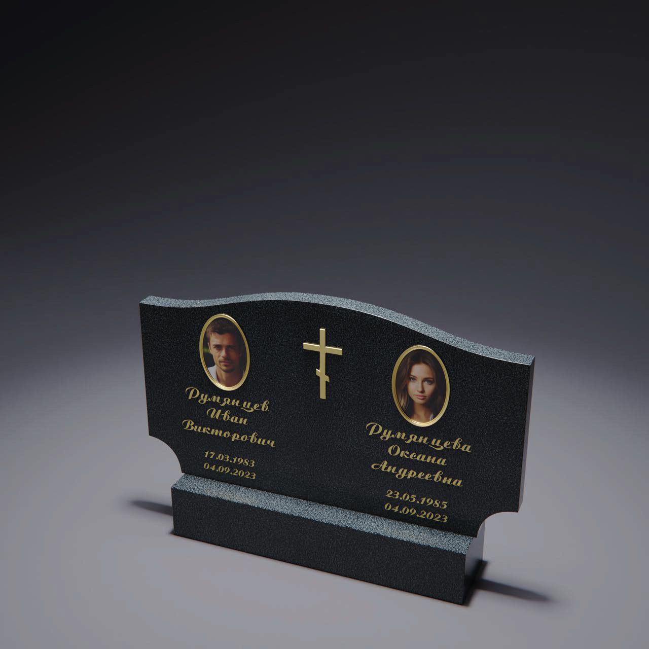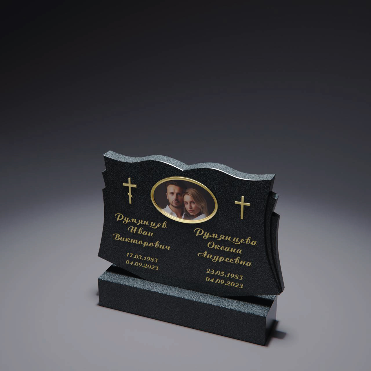 Семейный памятник с мягко изогнутым силуэтом, напоминающим плавные линии. В центре размещён овальный керамический портрет, объединяющий две жизни в одном образе. Боковые линии оформлены в асимметричном стиле, что придаёт памятнику динамику. Нижняя часть дополнена декоративным резными элементами. Верхняя плита имеет плавный скос, а нижняя массивная часть создаёт устойчивую опору для всей композиции.