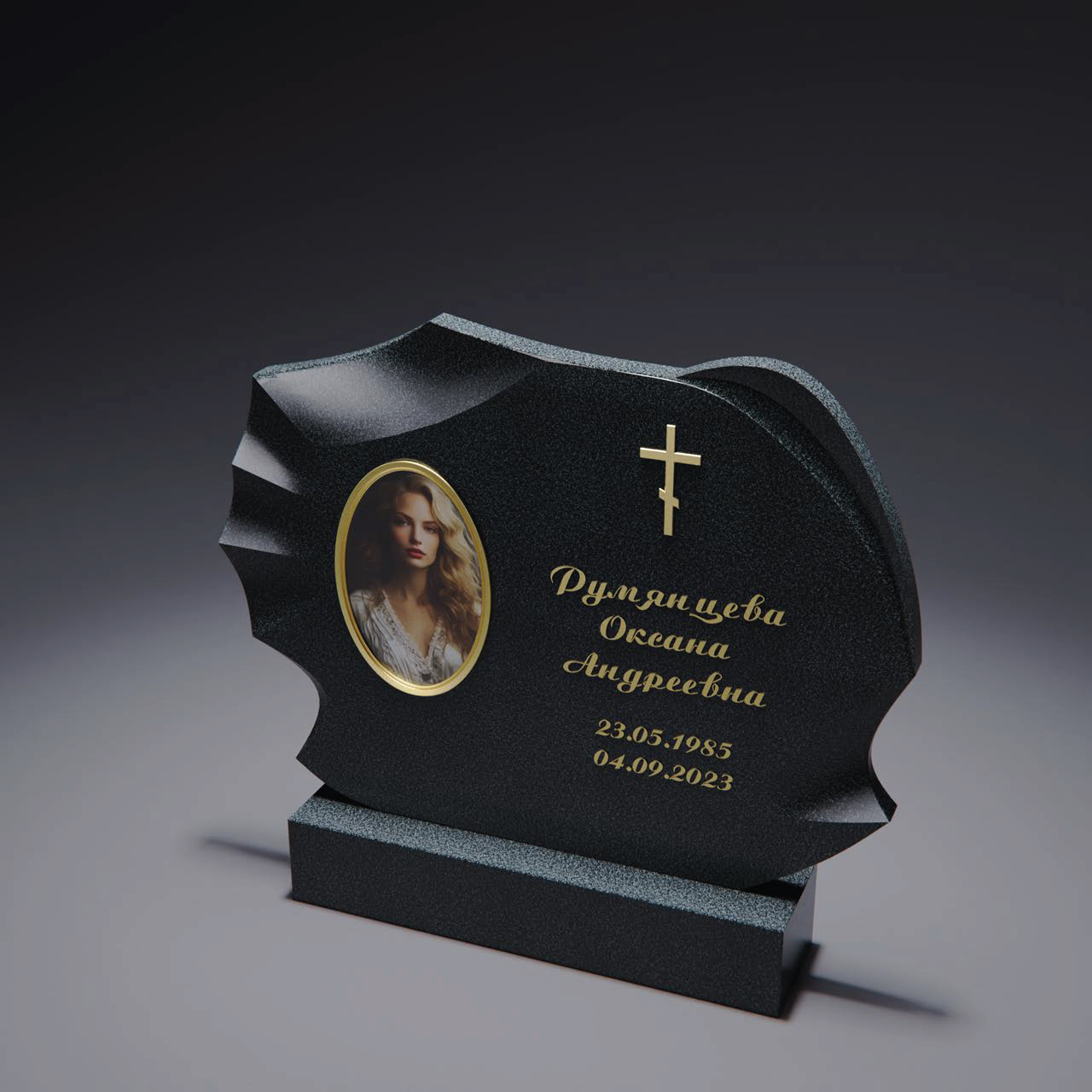 Семейный памятник асимметричной формы с чётко выраженными гранями и плавными скошенными линиями. В центре композиции расположен небольшой крест, подчеркивающий духовную составляющую. Поверхность тщательно отполирована, а боковые грани придают памятнику строгий и завершённый вид. Нижняя часть выполнена в виде массивного цельного основания, которое обеспечивает устойчивость и подчёркивает выразительность верхней части.