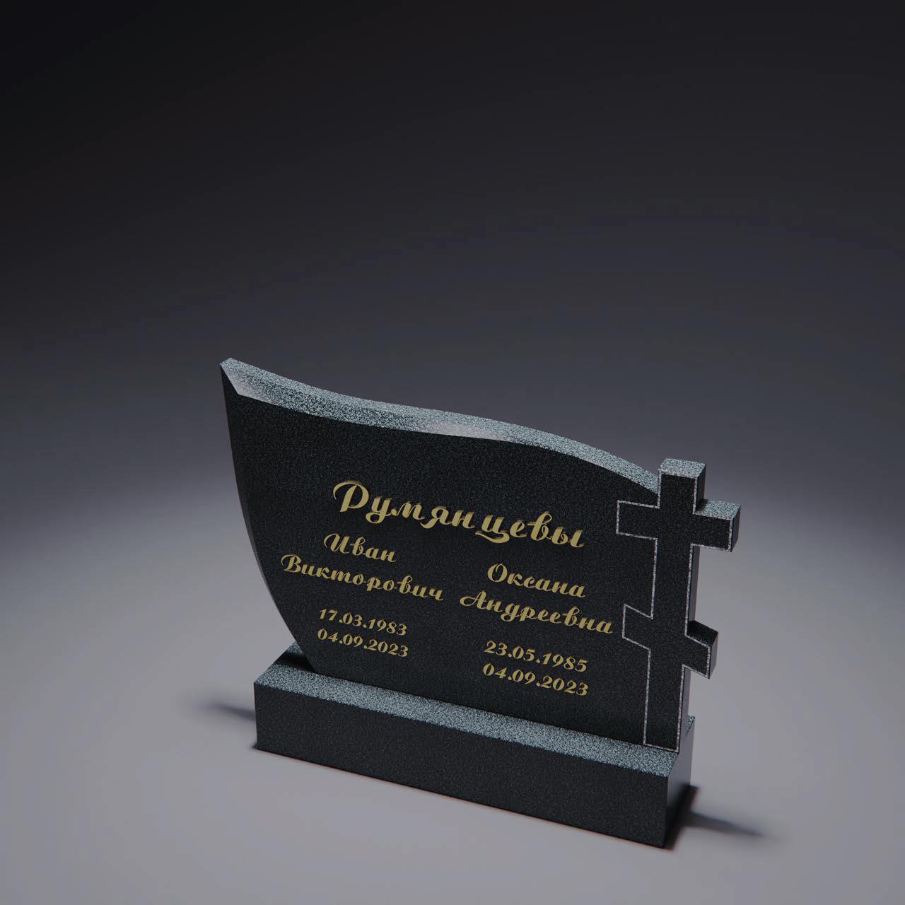 Семейный памятник в виде двух симметричных плит, между которыми возвышается резной православный крест. Полукруглые линии сверху символизируют единство и завершённость формы, а нижняя часть дополнена фигурным основанием с плавными выступами, придающими композиции монументальность и завершённость. Благодаря такому решению памятник смотрится гармонично и устойчиво, отражая идею крепкой духовной связи.