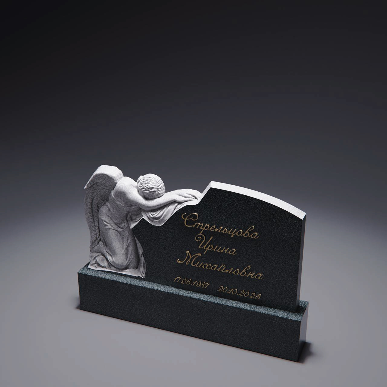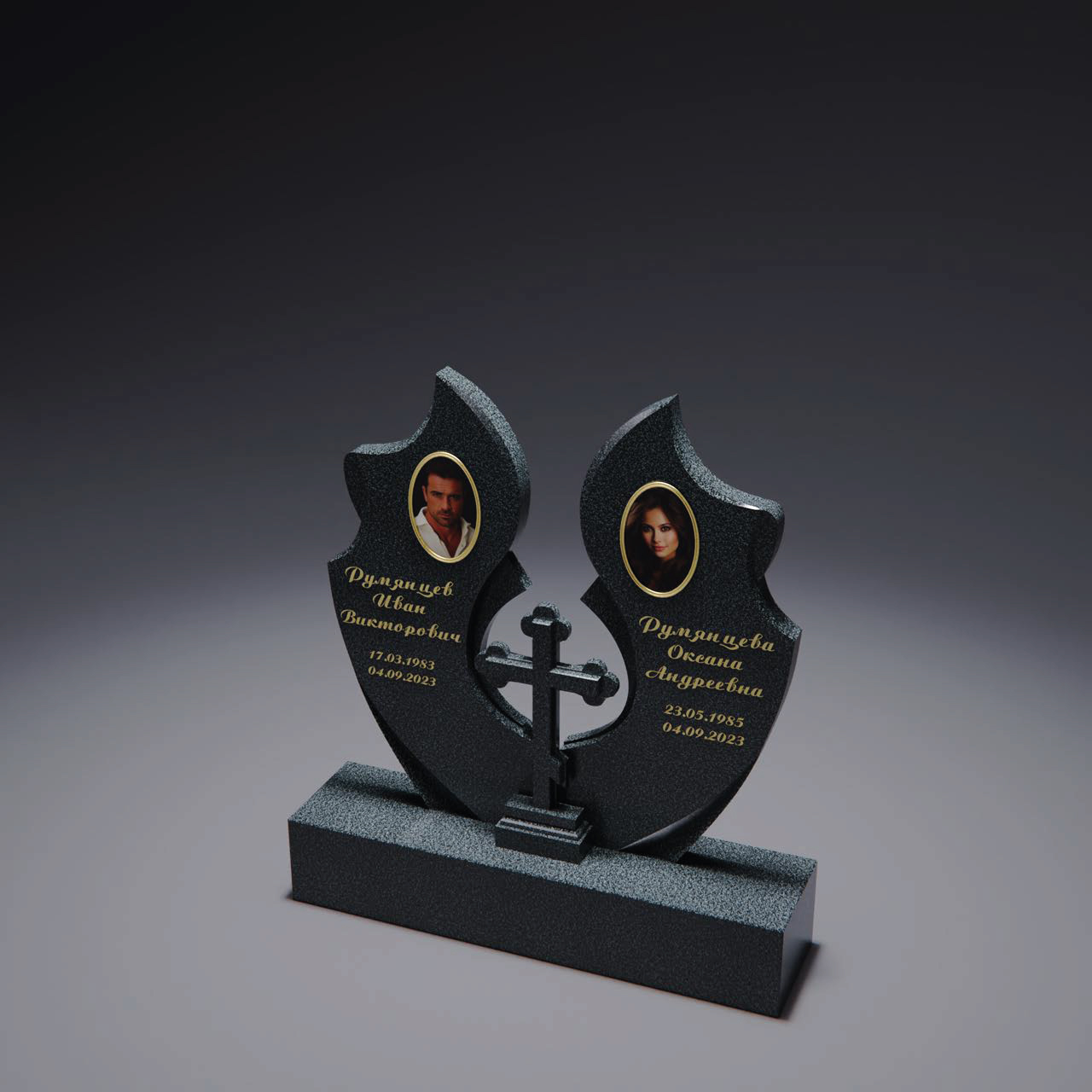 Семейный памятник в классическом стиле с двумя плитами, объединёнными центральной вставкой с православным крестом. Плавные дугообразные линии в верхней части придают композиции мягкость и гармонию. Прямоугольные портреты в рамке расположены симметрично, а широкий гранитный постамент обеспечивает устойчивость и завершённый вид. Такая форма подчёркивает единство и уважение к семейной памяти.