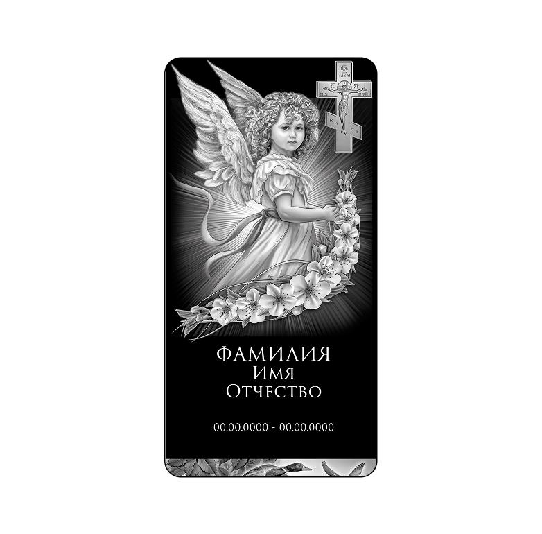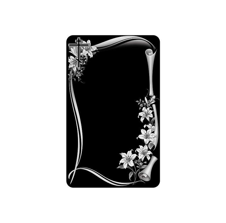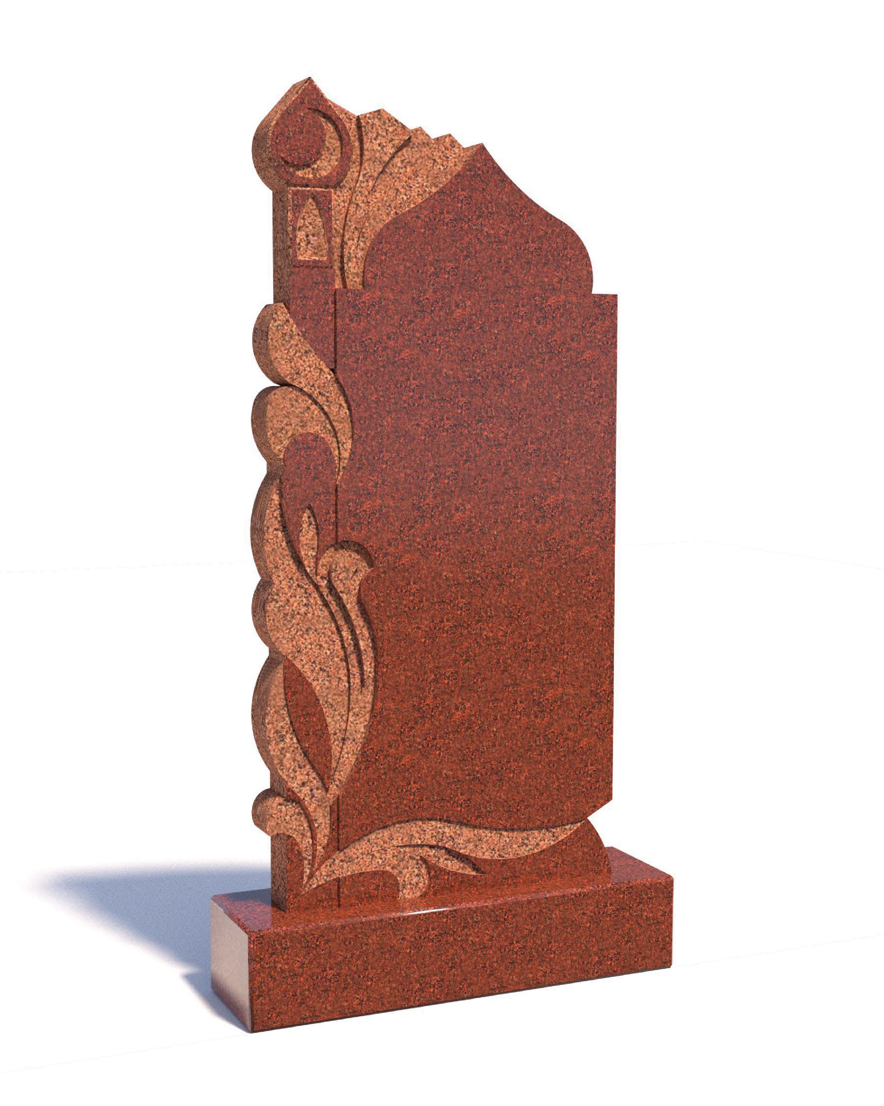 Монумент с плавно изогнутым силуэтом и декоративным вырезом в верхней части, где расположен строгий крест. Овальные портреты гармонично вписаны в каждую плиту, а лёгкая асимметрия форм создаёт эффект живого движения. Нижняя часть памятника усилена массивным основанием, которое обеспечивает долговечность и устойчивость.