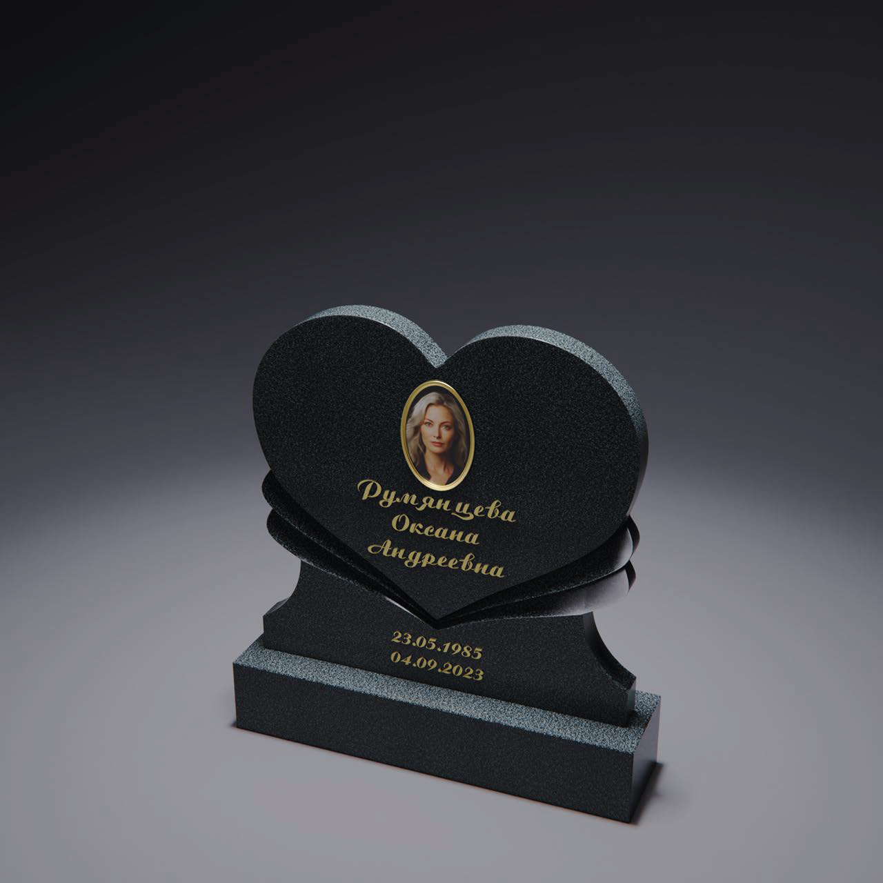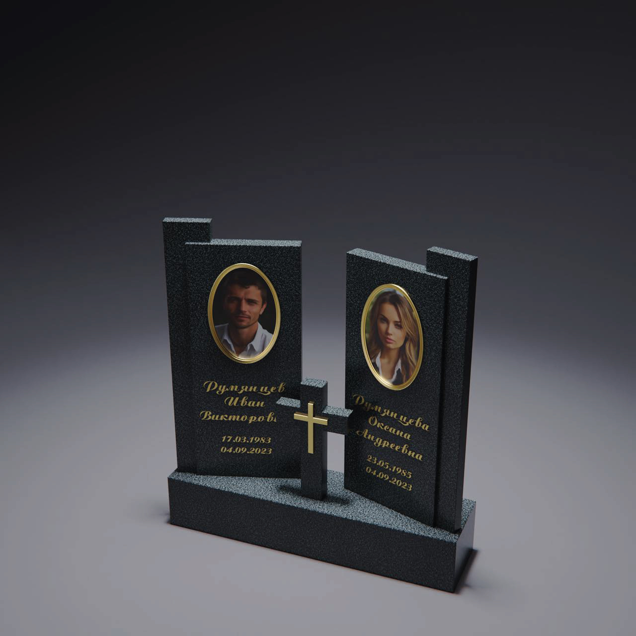 Композиция с изображением Мадонны в верхней части и тонким крестом, вписанным в линию овала. Линии плавные, переплетающиеся, создают ощущение заботы и покровительства. Овал в центре образует идеальное пространство для портрета. Такое оформление подойдёт для памятников, где хочется подчеркнуть духовную защиту.