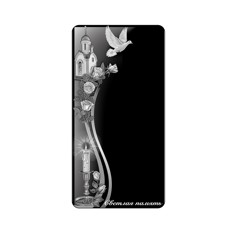 Оформление сочетает храм, парящего голубя и надпись в нижней части, создавая образ покоя и света. Архитектура храма детализирована и передана с теплом — купола и кресты сияют на фоне тёмного пространства.