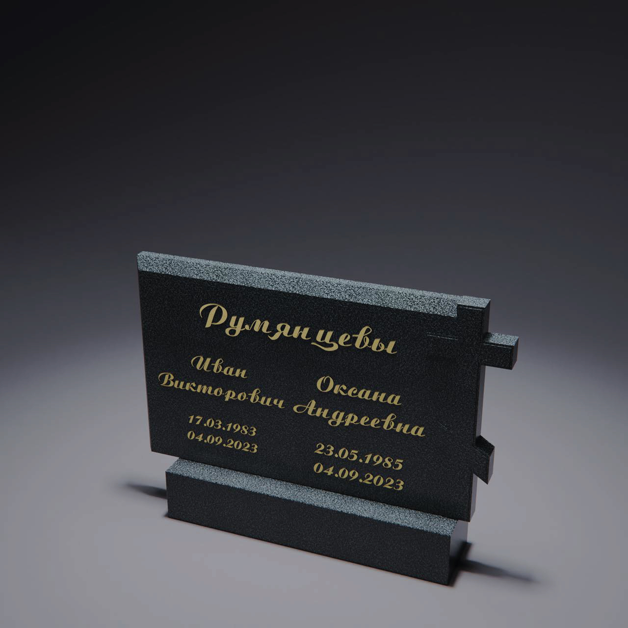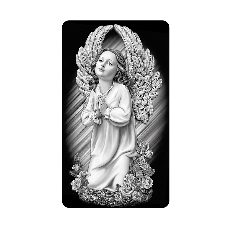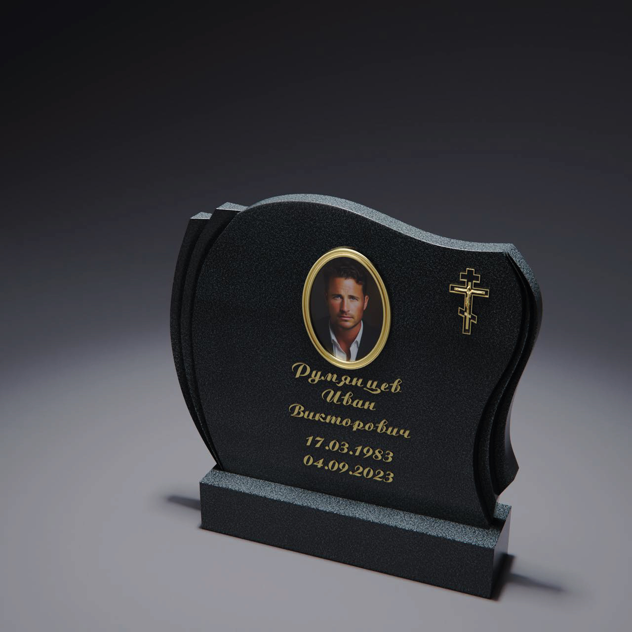 Свиток с приподнятым краем словно открывает страницу памяти. У подножия горит свеча — источник тепла и света. Рядом расположены розы с детализированными лепестками, добавляющие мягкости.