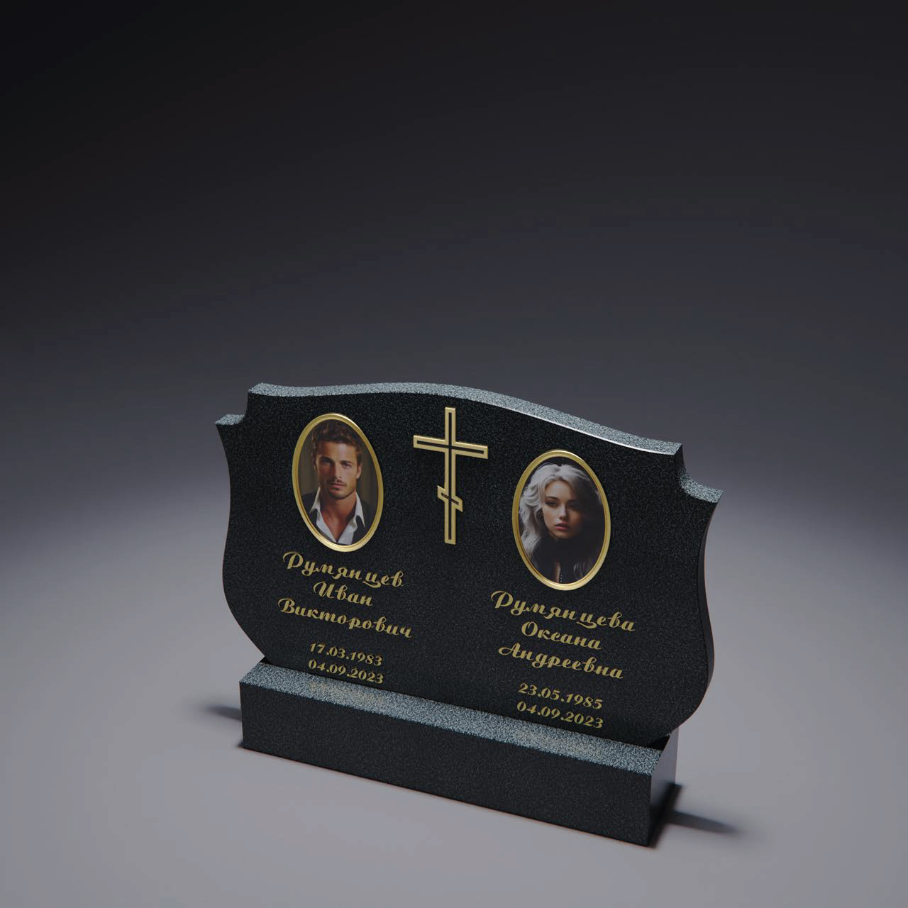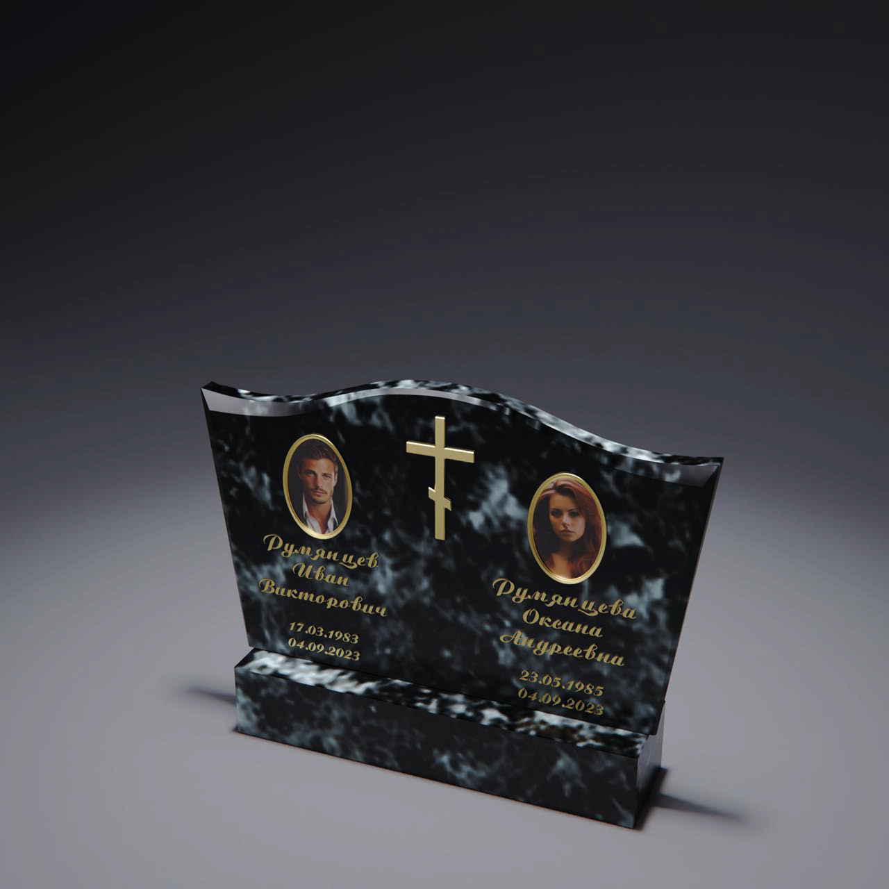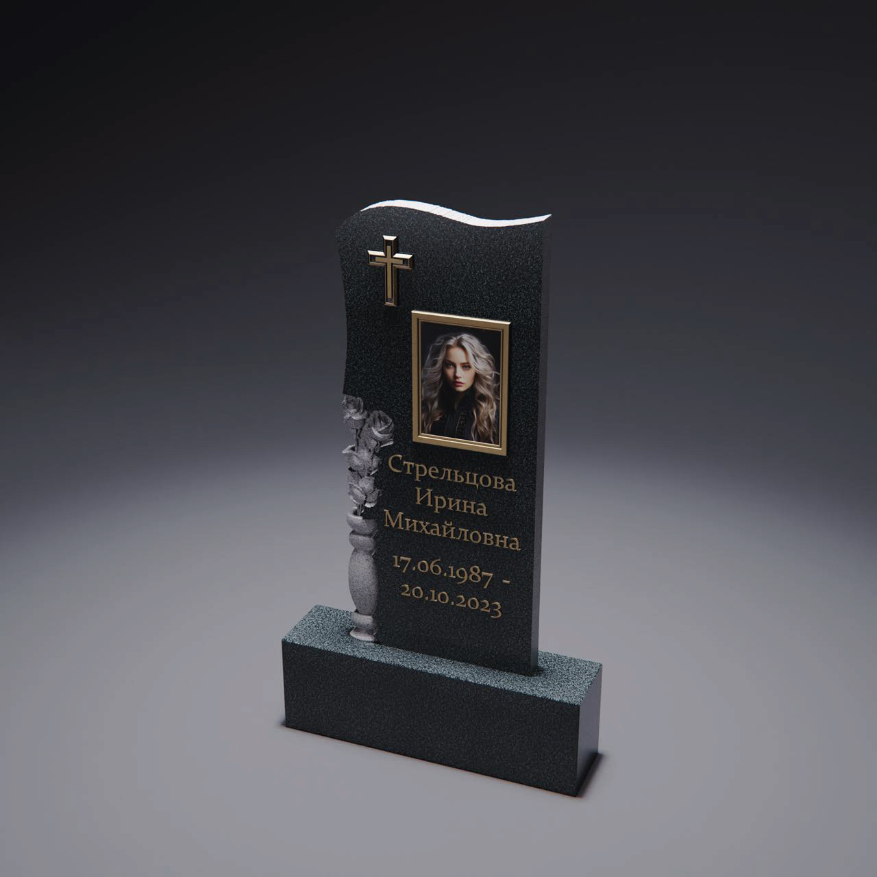 В композиции сочетаются храм, летящий голубь, свеча и розы — символы веры, памяти и душевного покоя. Эти элементы объединены плавной вертикальной линией, создающей ощущение восхождения и духовного света. Пламя свечи выполнено с мягким рельефом, что придаёт изображению лёгкое сияние. Надпись «Светлая память» гармонично завершает композицию, выражая уважение и любовь.