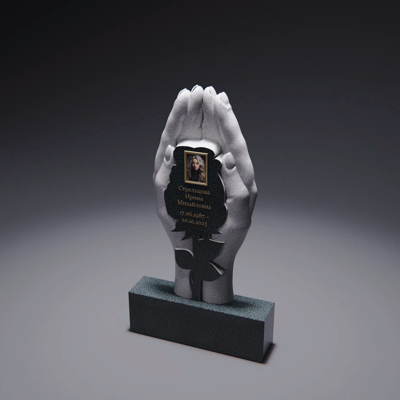 Фигура ангела, обращённого взглядом вверх, окружена светом, нисходящим с высоты. Его раскрытые крылья образуют мягкую арку, которая словно обнимает пространство памятника, придавая композиции гармонию и завершённость. Свет падает сверху, выделяя нежные черты лица и плавные линии рук, сложенных у груди.