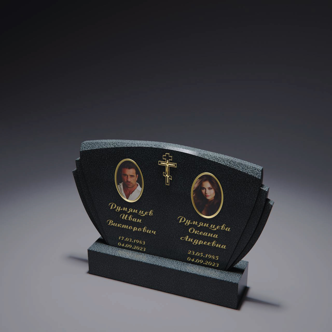 Рамка по периметру выполнена в виде плавных завитков с округлыми углами. Эти линии создают ощущение движения и мягкости, визуально смягчая строгие очертания памятника. Центральная часть оставлена свободной для портрета и надписей, а световые переходы на фоне придают глубину и лёгкий эффект свечения. Вся композиция выглядит уравновешенно и гармонично, сочетая изящество формы с спокойной выразительностью.