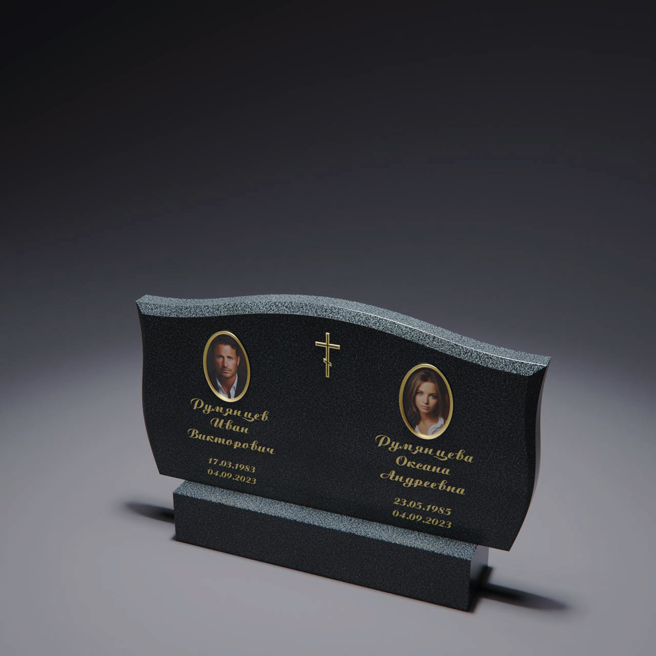 Контраст светлых элементов на тёмном фоне создаёт эффект объёма и мягкого свечения. Центральная часть оставлена для надписей. Такое оформление универсально и подходит для одиночных, а также семейных памятников, подчёркивая сдержанность и гармонию формы.